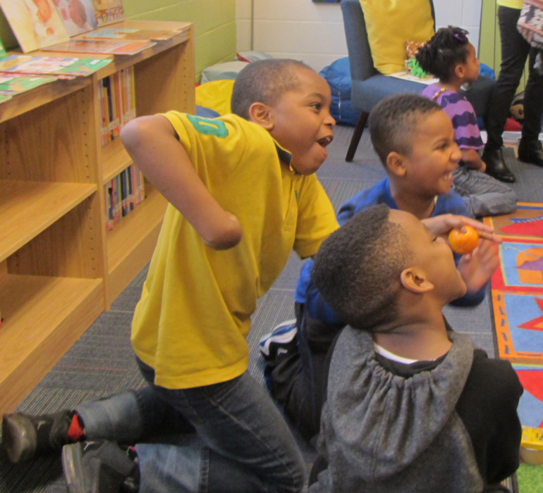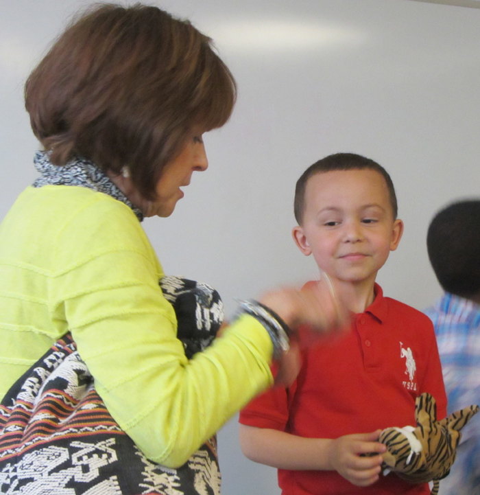 "Laura Krauss Melmed brought the story of Thanksgiving to life for first and second graders at Whittier Education Campus. During the animated reading of her book, "This First Thanksgiving Day" students eagerly engaged in finding all of the hidden animals. Following the interactive reading session, Laura discussed the importance of action words and led the students in a writing exercise involving the animals they discovered in her book.